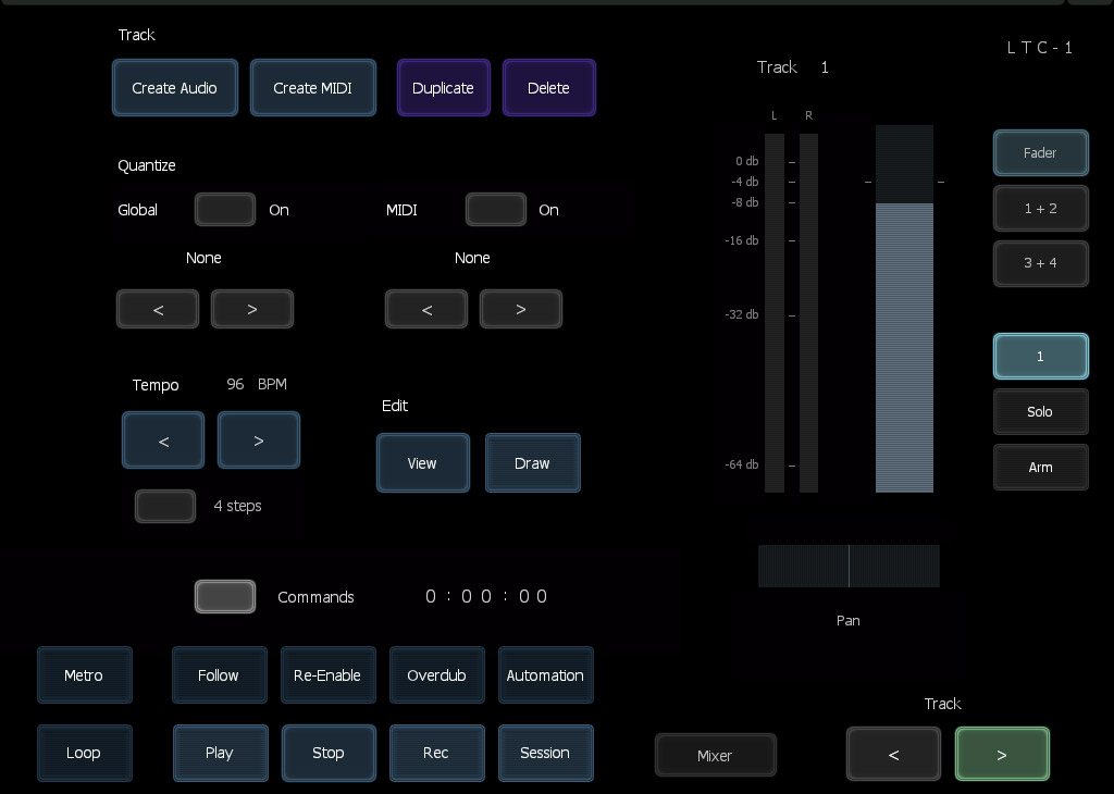 The LTC-1 is a touch based mixer focused on controlling up to 16 tracks and transport inside Ableton Live. It offers a flexible way for adjusting volume, pan and sends 1-4 along with muting, arming and soloing of the current track. The LTC-1 provides both single track and multitrack views, giving you the right level of control for the situation. LTC-1 works either alongside a hardware grid controller for working in Session view in Live or standalone for Arrangement view. Whether used on its own or with other hardware, LTC-1 brings the focus away from the computer screen and more towards creating music.