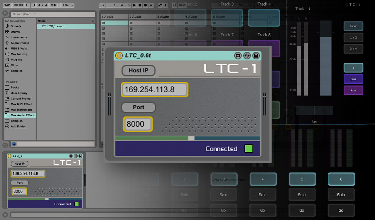 LTC-1 runs as a combination of a Lemur template and Max for Live audio device. The Max for Live device is placed on the master track in a Live project. Lemur and Max for Live communicate with each other bi-directionally through OSC. After loading the Max for Live device, enter in the network settings, making sure the 2-way connection indicator on the device lights up. Save the M4L device and then set the project to default on load in Live. Now the LTC-1 will be ready to go with each new Live project you start.